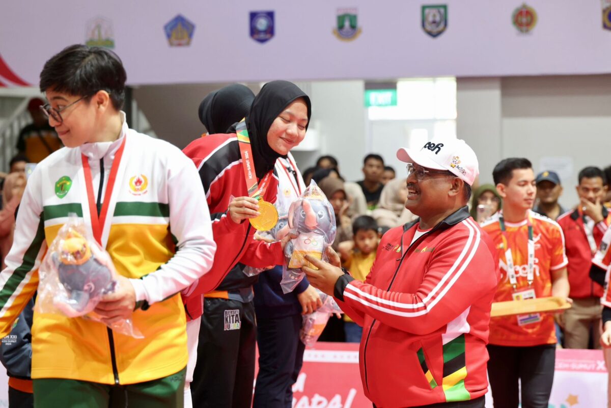 BANDA ACEH – Cabang olahraga Anggar kembali mempersembahkan medali emas untuk Aceh, melalui nomor Sabel Beregu Putri. Usai pertandingan final, Penjabat Gubernur Aceh Safrizal ZA, yang sejak awal laga menyaksikan aksi tim Aceh, mengalungkan medali kepada para pemenang.
