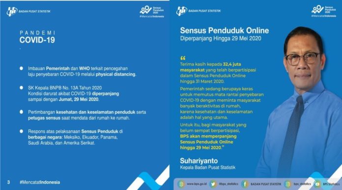 Batas waktu sensus penduduk online diperpanjang hingga 31 Mei 2020. Sebelumnya, batas pengisian SP online adalah 31 Maret 2020 dan diakibatkan mewabahnya Covid-19 yang masif di Indonesia, maka batas pengisian SP online diundur ke tanggal 29 Mei 2020.