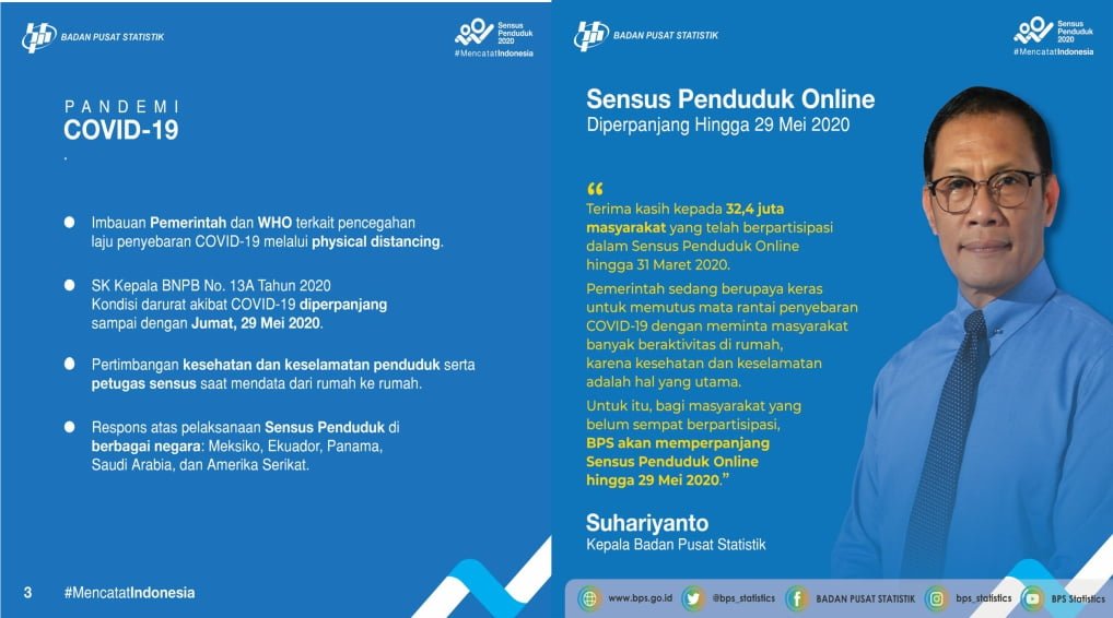 “Pemerintah sedang berupaya keras untuk memutus mata rantai penyebaran Covid19 dengan meminta masyarakat banyak beraktivitas di rumah karena kesehatan dan keselamatan adalah yang utama untuk itu, bagi masyarakat yang belum sempat berpartisipasi, BPS memperpanjang sensus online hingga 29 mei 2020” Ujar Suhariyanto.