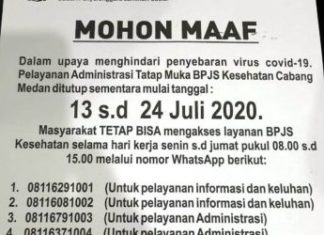 Analisaaceh.com, Medan | Kantor Badan Penyelenggara Jaminan Sosial (BPJS) Kesehatan Cabang Medan menghentikan layanan tatap muka, mulai hari ini, Senin (13/7/2020).