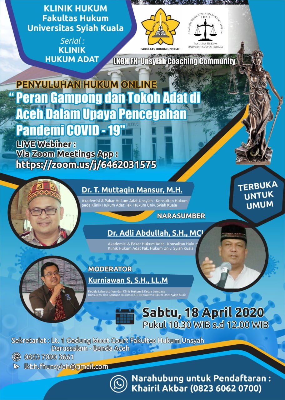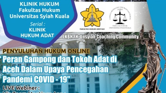 Penyuluhan Hukum Online tersebut menampilkan Serial Klinik Hukum Adat dengan mengangkat tema “Peran Gampong dan Tokoh Adat di Aceh Dalam Upaya Mencegah Penyebaran Pandemi Covid – 19”.