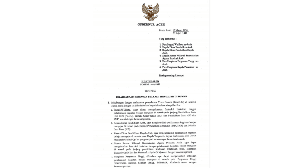 Surat edaran bernomor 440/4989 itu ditujukan kepada Bupati/Wali Kota se Aceh, Kepala Dinas Pendidikan Aceh, Kepala Dinas Pendidikan Dayah Aceh, Kepala Kanwil Kementerian Agama Aceh, para Pimpinan Perguruan Tinggi se Aceh serta para Pimpinan Dayah/Pesantren se Aceh.