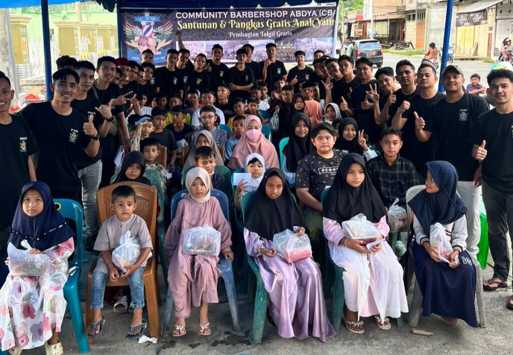 Analisaaceh.com, Blangpidie | Community Barbershop Abdya (CBA) memberikan layanan pangkas rambut gratis, santunan dan pembagian takjil kepada anak yatim-piatu di Kecamatan Blangpidie, Kabupaten Aceh Barat Daya (Abdya), Minggu (16/3/2025).