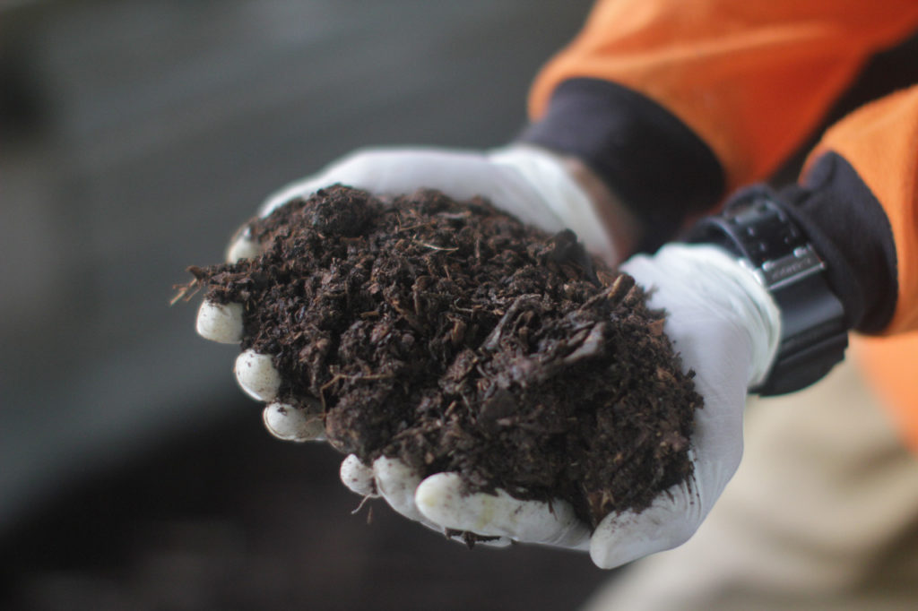 “Setelah kita ayak, kita diamkan selama sehari agar binatang pemakan akar yang ada di kompos itu hilang,” kata Sugimin, pekerja di Composting House.