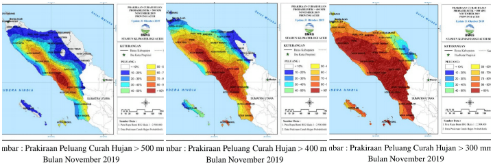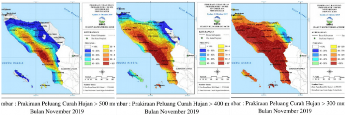 Informasi tersebut dikeluarkan berdasarkan monitoring, analisis dan prakiraan curah hujan bulan November 2019 dengan peluang curah hujan >300 mm dengan potensi “waspada” terjadi di Kab/Kota : Aceh Besar bagian Selatan, Pidie bagian Utara, Pidie Jaya, Bireuen, Aceh Utara bagian Barat, Bener Meriah, Aceh Tengah, Aceh Tenggara bagian Timur, Aceh Timur bagian Selatan, Aceh Tamiang bagian Selatan, Aceh Jaya bagian barat, Aceh Barat bagian selatan, Nagan Raya bagian Selatan, Aceh Selatan bagian Selatan, Subulussalam bagian Barat, Aceh Singkil bagian Barat dan Simeulue.