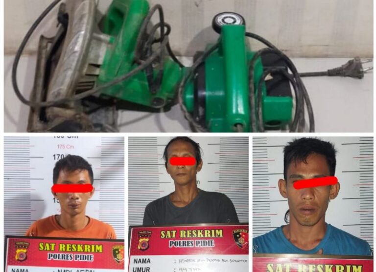Analisaaceh.com, Sigli | Tiga warga Pidie diringkus Polisi lantaran diduga melakukan pencurian sejumlah alat bangunan di sebuah ruko Gampong Dayah Bubue, Kecamatan Peukan Baro.