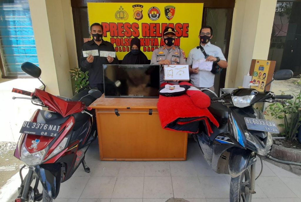 “Kami juga menyita hasil dari kejahatan berupa satu unit sepeda motor merk Yamaha Mio 125 warna hitam merah dengan nomor polisi BL 3376 NAI serta STNK, satu unit sepeda motor merk Yamaha Mio GT warna hitam biru dengan nomor polisi BL 6033 LAM serta STNK, satu unit TV LED Merk Toshiba 32 dan satu lembar karpet RASPUR warna merah hitam,” kata Muchtar Chalis.