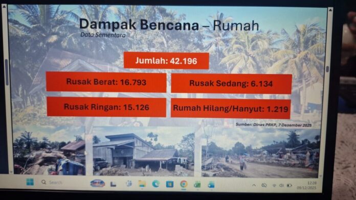 Dalam infografis yang bersumber dari Dinas PRKP dan bertanggal 7 Desember 2025, tercatat total 42.196 unit rumah terdampak. Namun, ketika kategori kerusakan dijumlahkan, Rusak Berat 16.793 unit, Rusak Sedang 6.134 unit, Rusak Ringan 15.126 unit, serta Rumah Hilang/Hanyut 1.219 unit, angka kumulatifnya hanya mencapai 39.272 unit. Selisih 2.924 unit itu masih belum memiliki penjelasan yang jelas.