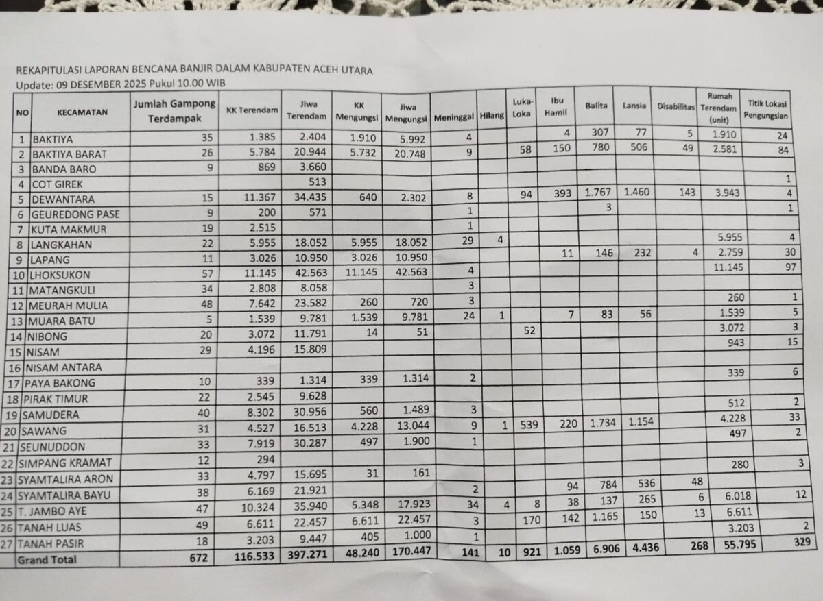 Analisaaceh.com, Aceh Utara | Ketidaksinkronan data kerusakan rumah akibat banjir besar di Aceh Utara kembali menjadi sorotan. Dalam kurun sekitar lima hari, laporan resmi Posko Bencana Banjir Aceh Utara menunjukkan perubahan signifikan pada jumlah total rumah terdampak, sehingga memunculkan pertanyaan publik mengenai akurasi pendataan di lapangan.