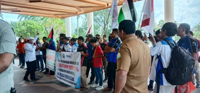 Analisaaceh.com, Banda Aceh | Puluhan buruh dari Federasi Serikat Pekerja Metal Indonesia (FSPMI), Asosiasi Serikat Pekerja Indonesia (ASPEK), PT Kelapa Sawit Nabati Subulussalam dan Aliansi Buruh Aceh (ABA) demo menjelang penetapan Upah Minimum Provinsi (UMP) tahun 2024 demo kantor Gubernur Aceh pada Senin (20/11/2023).
