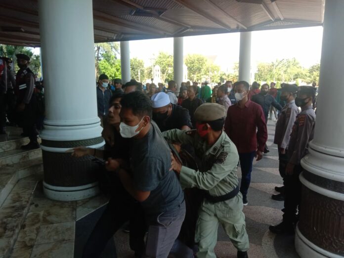 Analisaaceh.com, Banda Aceh | Aksi demo yang dilakukan oleh sejumlah mahasiswa di Kantor Gubernur Aceh berakhir ricuh pada Kamis (14/4/2022).