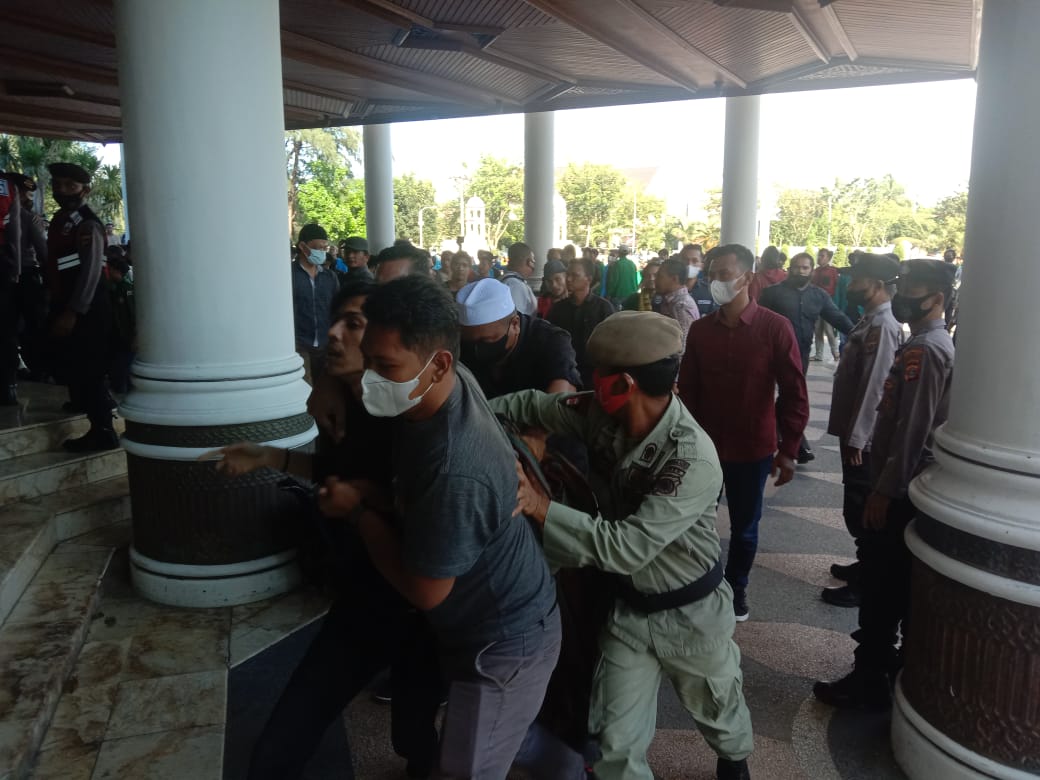 Ketidakhadiran Gubernur Aceh, Nova Iriansyah untuk menemui massa membuat massa aksi marah dan berusaha menerobos masuk ke dalam kantor gubernur. Namun karena dihalangi oleh petugas keamanan sehingga terjadi kericuhan.
