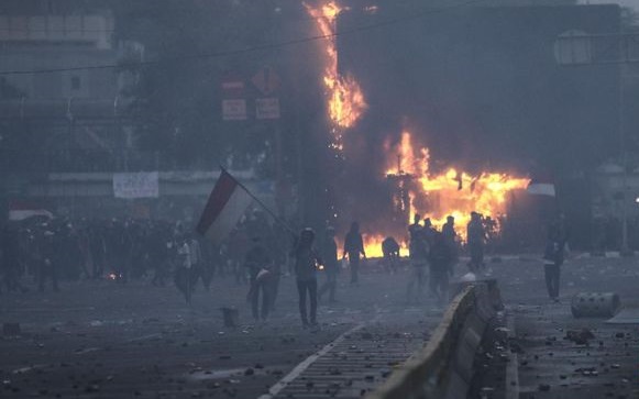 Analisaaceh.com |Â Halte Transjakarta di Bundaran Hotel Indonesia (HI) terbakar. Api terlihat membesar saat demo menolak Omnibus Law di Jakarta Pusat rusuh. Tak hanya itu sejumlah Pos Polisi juga turut hangus, Kamis (8/10).
