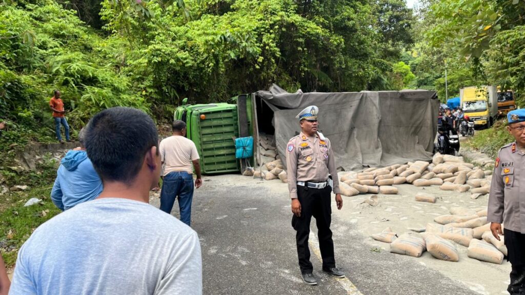 Analisaaceh.com, Tapaktuan | Sebuah truk tronton bermuatan semen terguling di tikungan tajam kawasan Gunung Panjupian, Gampong Panjupian, Kecamatan Tapaktuan, Aceh Selatan, Rabu (25/6/2025) pagi. Kecelakaan tunggal itu diduga akibat rem blong saat melintas di jalan menurun Tapaktuan–Blangpidie.