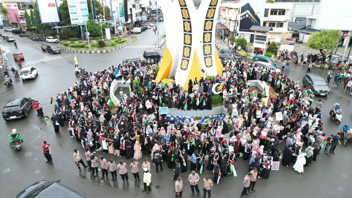 Poster bertuliskan “Free Palestine”, “Stop Genocide in Gaza”, dan “From Aceh to Al-Quds: Solidarity Never Dies” tersebar di berbagai sudut aksi. Takbir dan pekikan semangat terus menggema sepanjang kegiatan.