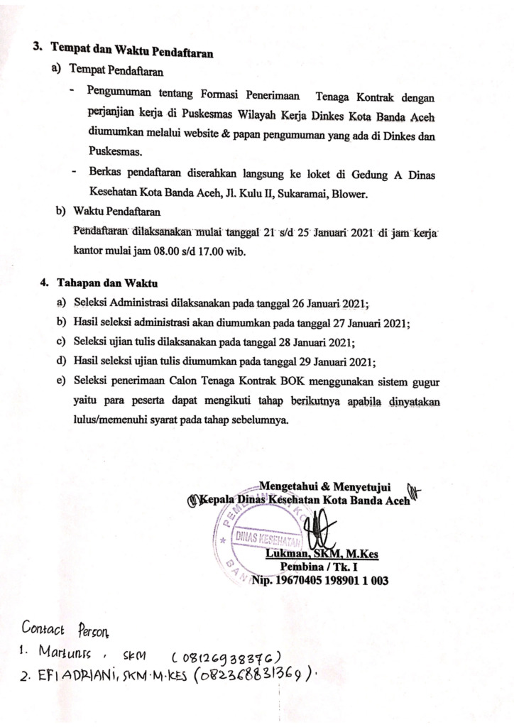 Analisaaceh.com, Banda Aceh | Dinas Kesehatan Kota Banda Aceh membuka penerimaan tenaga kontrak Bantuan Operasional Kesehatan (BOK) dengan perjanjian kerja di puskesmas pada Tahun Anggaran 2021.