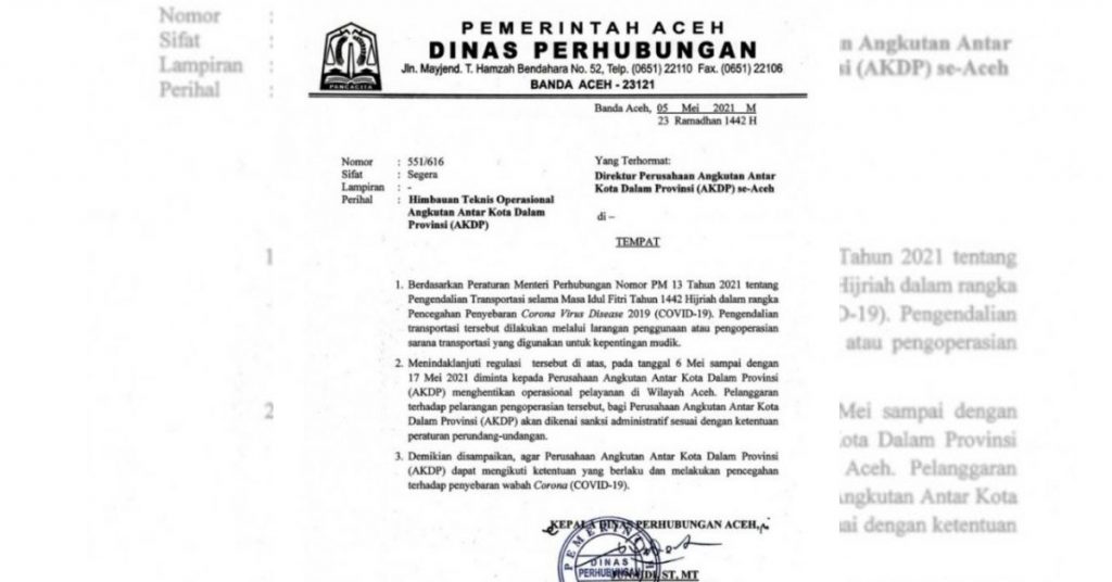 Analisaaceh.com, Banda Aceh | Pemerintah Aceh melalui Dinas Perhubungan Aceh melarang Angkutan Umum Antar Kota dalam Provinsi (AKDP) untuk beroperasi sejak hari ini, Kamis (06/05/2021) hingga 17 Mei 2021.