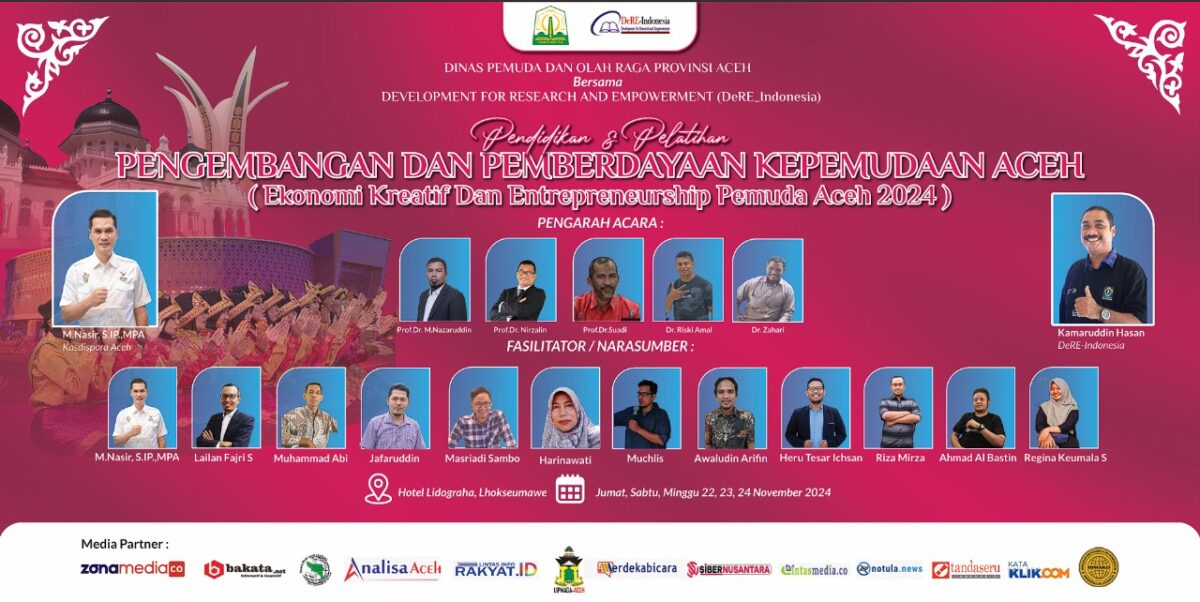 Analisaaceh.com, Lhokseumawe | Dinas Pemuda dan Olahraga (Dispora) Provinsi Aceh bekerja sama dengan Development for Research and Empowerment (DeRE Indonesia) dan Himpunan Mahasiswa Ilmu Komunikasi (HIMAKO) mengadakan Diklat Pengembangan dan Pemberdayaan Kepemudaan Aceh 2024. Pelatihan bertemakan “Penguatan Ekonomi Kreatif dan Entrepreneurship Kepemudaan Aceh Era Digital” ini berlangsung selama tiga hari, mulai Jumat hingga Minggu, 22–24 November 2024, di Hotel Lido Graha, Lhokseumawe.