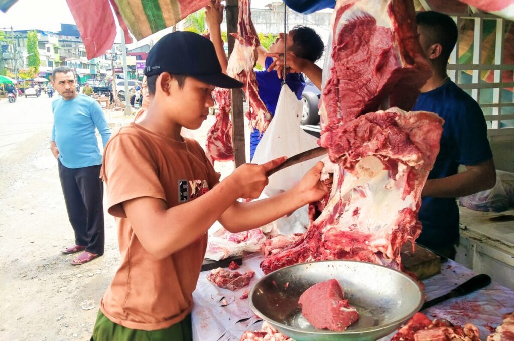 Pedagang saat memotong daging Meugang di Blangpidie Kabupaten Abdya. Foto:Analisaaceh.com/Ahlul Zikri