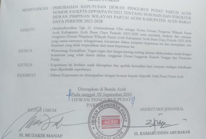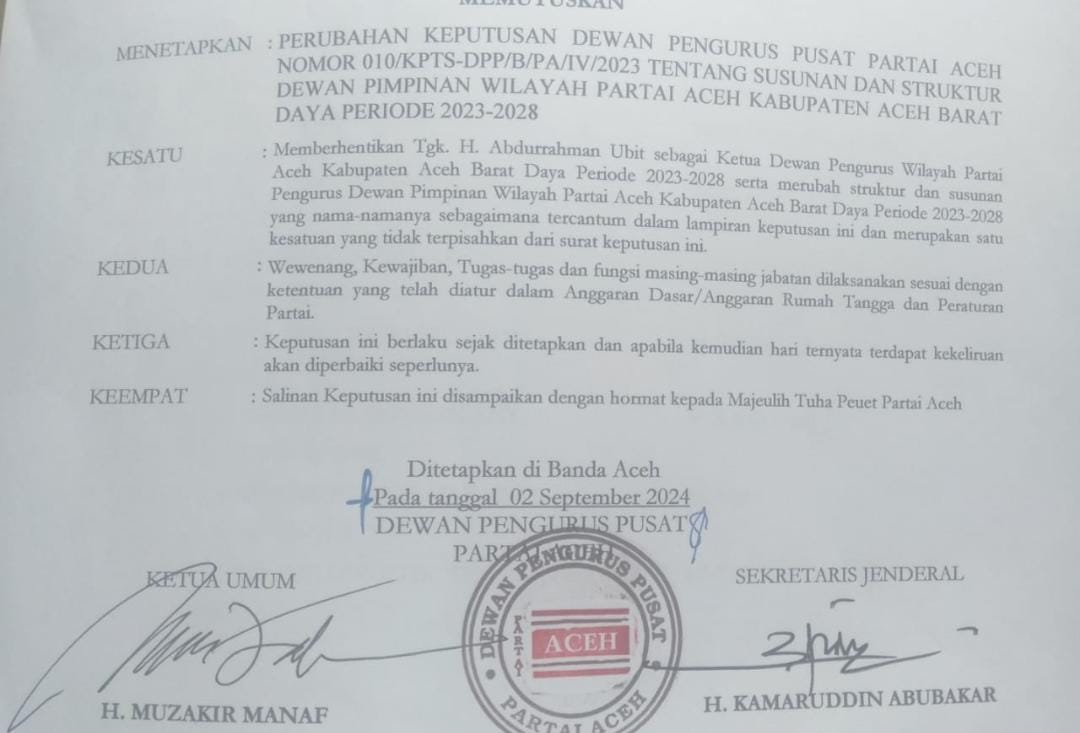 Pemberhentian tersebut tercantum dalam Surat Keputusan DPP PA, nomor :074/KPTS-DPP/B/PA/IX/2024. Tentang perubahan keputusan DPP PA nomor : 010/KPTS-DPP/B/PA/IV/2023 tentang struktur dan pengurus DPW PA Abdya, periode 2023-2028.