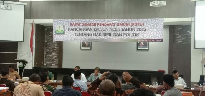 Analisaaceh.com, Banda Aceh | Badan Legislasi Dewan Perwakilan Rakyat Aceh (DPRA) menggelar Rapat Dengar Pendapat Umum (RDPU) Rancangan Qanun (Raqan) Aceh tahun 2022 tentang hak sipil dan politik pada Senin (28/3/2022).