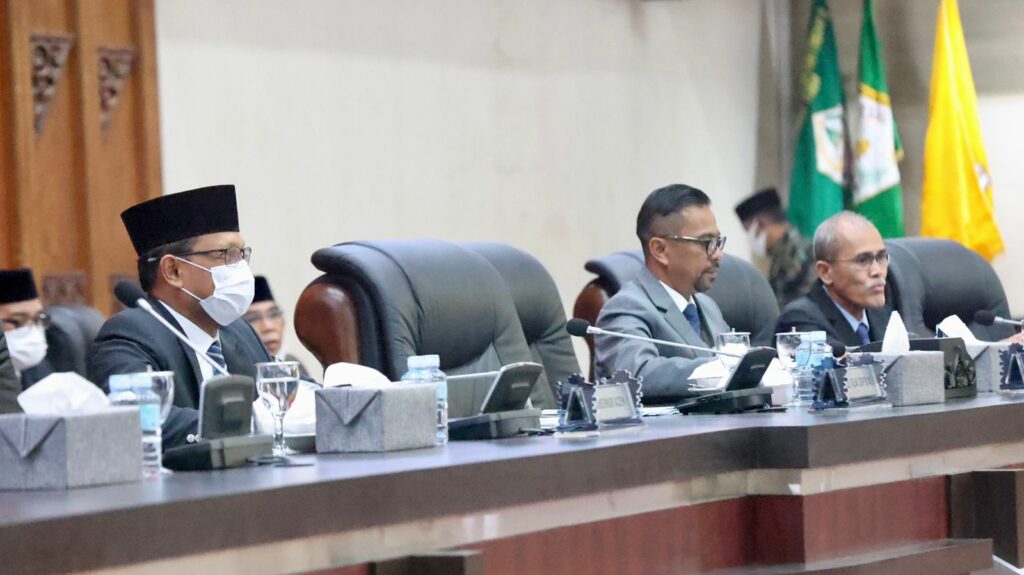 Asisten I Sekda Aceh, M Jafar, menghadiri rapat paripurna DPRA dengan agenda penyampaian pendapat akhir Fraksi-Fraksi DPRA terhadap rancangan 5 Qanun Prolega Prioritas Aceh tahun 2021, di Gedung Utama DPRA, Banda Aceh, Selasa (28/12/2021)