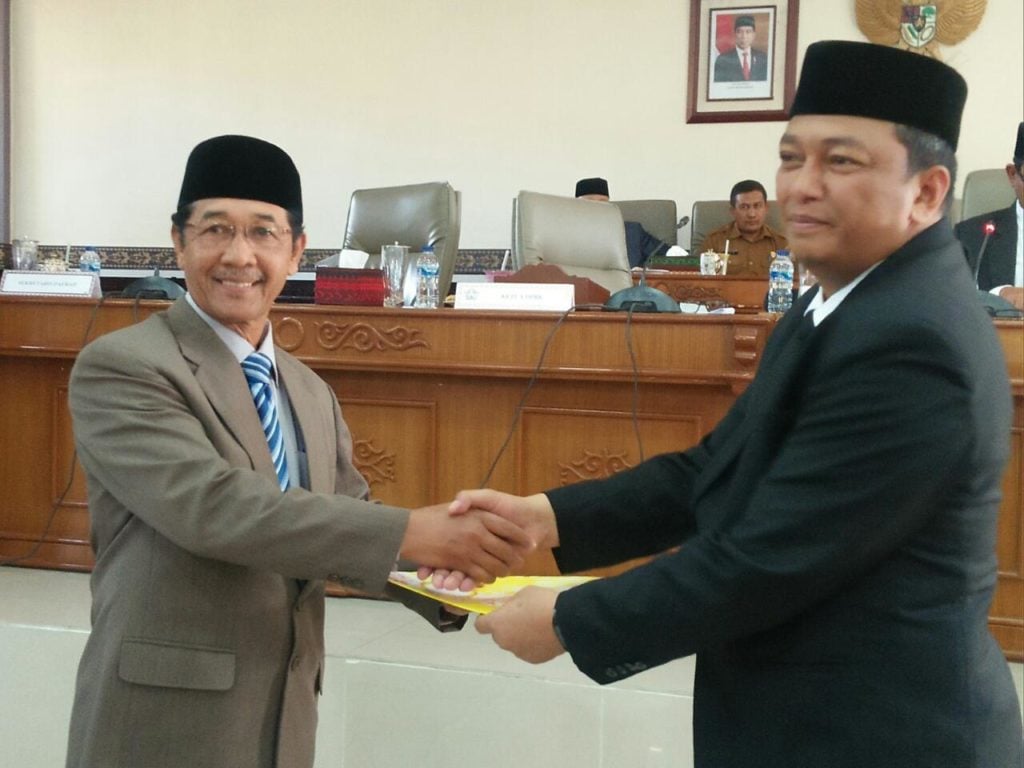 Ketua DPRK Aceh Tengah Arwin Mega menyerahkan dokumen rapat paripurna Rancangan Qanun Retribusi dan SOTK kepada Sekda Aceh Tengah Karimansyah (Foto/Karmiadi)