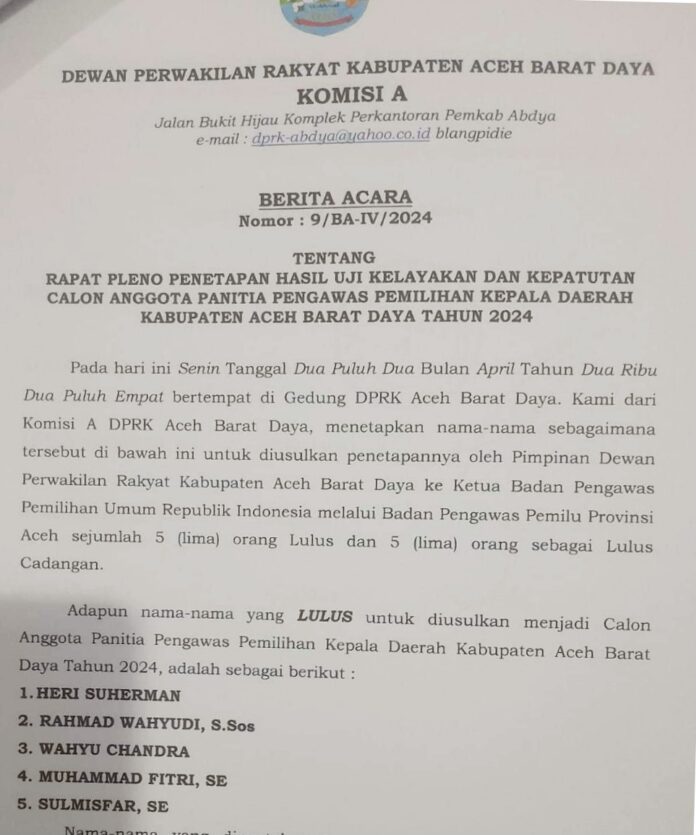 Berita acara penetapan nama anggota Panwaslih Abdya. Foto: Ist