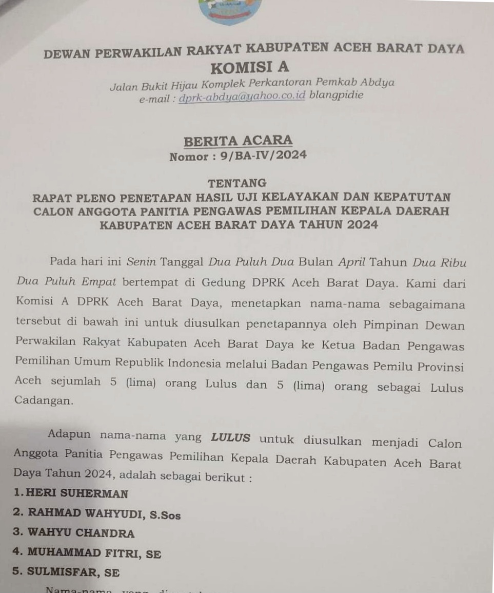 Analisaaceh.com, Blangpidie | Komisi A Dewan Perwakilan Rakyat Kabupaten (DPRK) Aceh Barat Daya (Abdya) menetapkan lima anggota Pengawas Pemilihan (Panwaslih) Pilkada 2024.