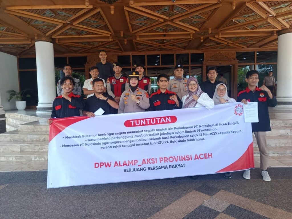 Analisaaceh.com, Banda Aceh | Dewan Pimpinan Wilayah Aliansi Lembaga Advokasi Masyarakat Pertanian (DPW ALAMP) menggelar aksi di halaman Kantor Gubernur Aceh, Jumat (12/9/2025), menuntut pemerintah segera menindak dugaan pelanggaran Hak Guna Usaha (HGU) PT Nafasindo di Kabupaten Aceh Singkil.