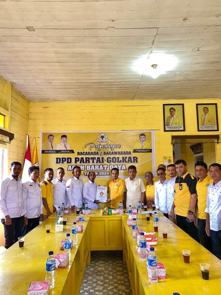 Berkas pendaftaran tersebut diterima langsung Ketua DPD II Partai Golkar Abdya Agusri Samhadi didampingi Korda Golkar Dapil 9 Aceh, H Syamsidik Ibrahim, Ketua Penjaringan Bacalon Bupati Abdya, Muhammad Iqbal, Kuantim Golkar Drs Darmansyah dan kader Golkar lainnya.
