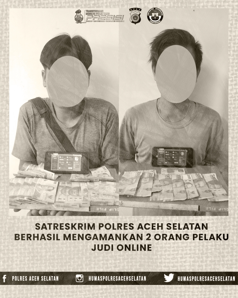 Analisaaceh.com, Tapaktuan | Satuan Reserse Kriminal (Satreskrim) Polres Aceh Selatan meringkus dua orang pria yang diduga sebagai agen judi online Higgs Domino.