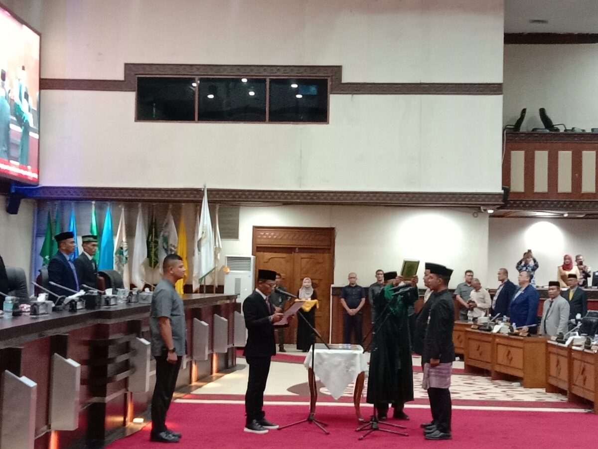 Analisaaceh.com, Banda Aceh | Ketua Dewan Perwakilan Rakyat Aceh (DPRA), Zulfadli, secara resmi melantik dan mengambil sumpah dua anggota dewan yang menggantikan anggota sebelumnya yang mencalonkan diri sebagai kepala daerah untuk periode 2024–2029. Prosesi pelantikan berlangsung pada Jumat (22/11/2024) sore di gedung utama DPRA.