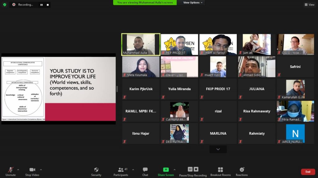 Dosen Magister Pendidikan Bahasa Inggris USK Dr. Muhammad Aulia, M.TESOL, dihadapan para peserta webinar memaparkan tiga nasihat dan tips untuk sukses dalam penyelesaian disertasi.