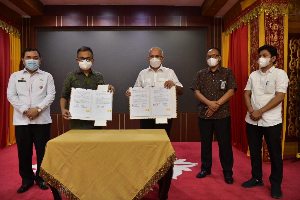 Sekretaris Daerah Aceh, dr. Taqwallah M.Kes, bersama Kepala Badan Narkotika Nasional (BNN) Provinsi Aceh, Brigjen Pol. Drs. Heru Pranoto, menandatangani naskah serahterima hibah tanah antara pemerintah Aceh dengan BNN Provinsi Aceh, di Pendopo Gubernur Aceh, Banda Aceh, Rabu (14/7/2021).