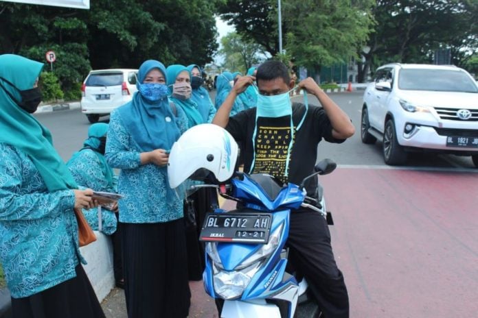 Analisaaceh.com, Banda Aceh | Tim Penggerak PKK Kecamatan Baiturrahman dan pengurus PKK Gampong dalam kecamatan tersebut melakukan aksi bagi-bagi masker. Kegiatan ini dilakukan di se putaran Simpang Jam, Banda Aceh, Senin (20/4/2020).