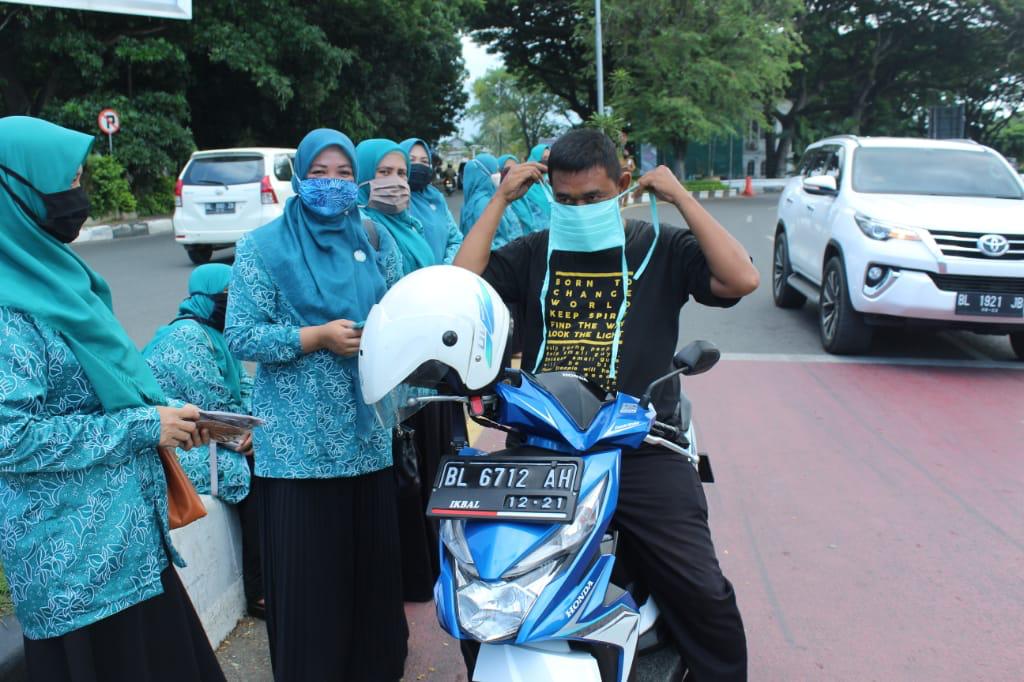Jumlah masker yang dibagikan mencapai 600 lembar. Dipimpin langsung Ketua TP PKK Baiturrahman Helda Saflia, organisasi ini memberikan masker gratis ke setiap warga yang melintas.