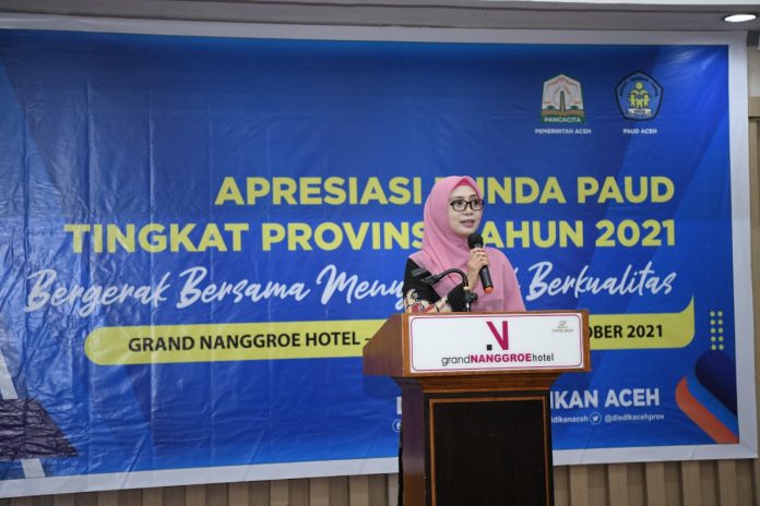 Analisaaceh.com, Banda Aceh | Bunda Pendidikan Anak Usia Dini (PAUD) Aceh, Dyah Erti Idawati, Senin (25/10/2021), membuka secara resmi kegiatan Apresiasi Bunda PAUD Tingkat Provinsi Tahun 2021, dengan tema “Bergerak Bersama Menuju PAUD Berkualitas”. Acara itu berlangsung di Hotel Grand Nanggroe, Banda Aceh.