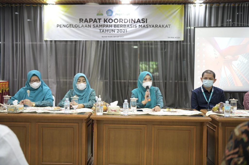 Ketua Tim Penggerak PKK Aceh, Dyah Erti Idawati Menyampaikan Materi pada Acara Rapat Koordinasi Pengelolaan Sampah Berbasis Masyarakat di Aula Wisma Permata Hati, Banda Aceh, Sabtu (24/7/2021).