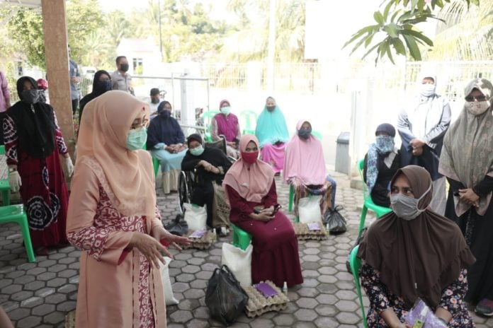 Analisaaceh,com, Banda Aceh | Wakil Ketua Tim Gugus Tugas Percepatan Penanganan Covid-19 Aceh, Dyah Erti Idawati, menyerahkan bantuan sosial BKM Ikhlas Peduli Program Kotaku Banda Aceh bagi masyarakat rentan Terdampak Covid-19, di Geuceu Menara, Senin 20/04.