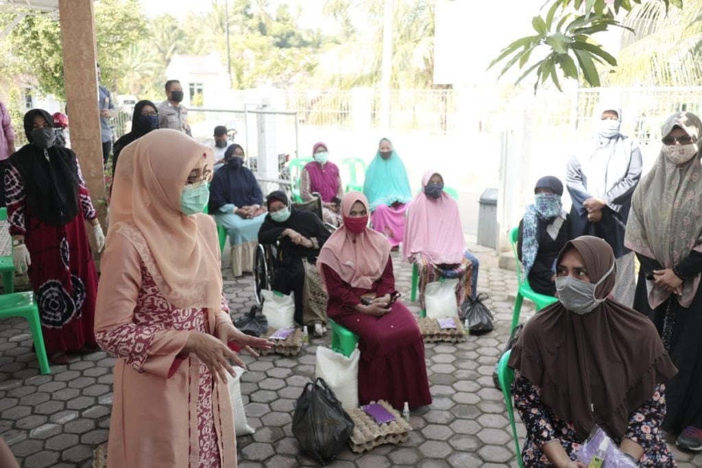 Wakil Ketua Tim Gugus Tugas Percepatan Penanganan Covid-19 Aceh, Dyah Erti Idawati, menyerahkan bantuan sosial BKM Ikhlas Peduli Program Kotaku Banda Aceh bagi masyarakat rentan Terdampak Covid-19, di Geuceu Menara, Senin 20/04. Bantuan sembako itu diberikan kepada sedikitnya 60 orang janda dan manula.