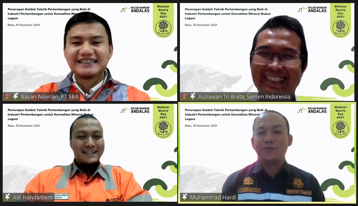 Sejalan dengan hal ini, PT Solusi Bangun Andalas (SBA) yang merupakan anak Perusahaan dari PT Solusi Bangun Indonesia Tbk dan bagian dari PT Semen Indonesia (Persero) Tbk atau SIG menggelar Webinar Quarry Day 2021 dengan tema “Penerapan Kaidah Teknik Pertambangan yang Baik pada Industri Pertambangan Komoditas Mineral Bukan Logam”.