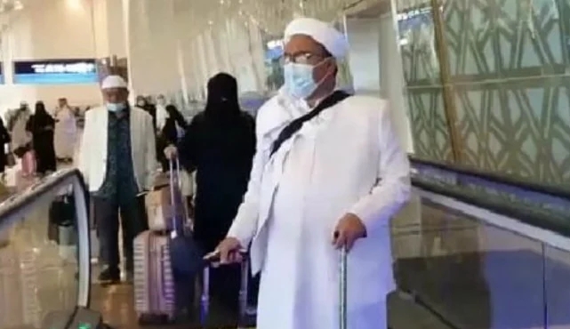 Dengan menggunakan jubah putih beserta sorban putih, Habib Rizieq terlihat berjalan santai di atas travelator. Sambil membawa kopor dan tongkat Habib Rizieq terus berjalan menuju pintu keluar Bandara Soekarno Hatta.
