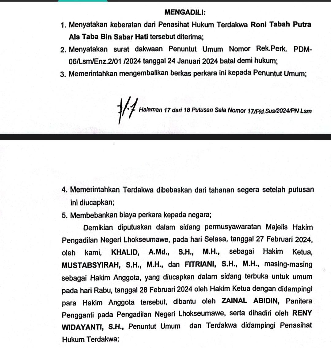 Berdasarkan salinan putusan sela nomor 17/Pid.Sus/2024/PN Lsm, yang diterima redaksi ada lima putusan yang dibacakan oleh majelis hakim. Putusan sela ini dibacakan dihadapan Jaksa Penuntut Umum Kejari Lhokseumawe, Reny Widayanti, SH dan penasehat hukum terdakwa Fakhrurrazi, SH.
