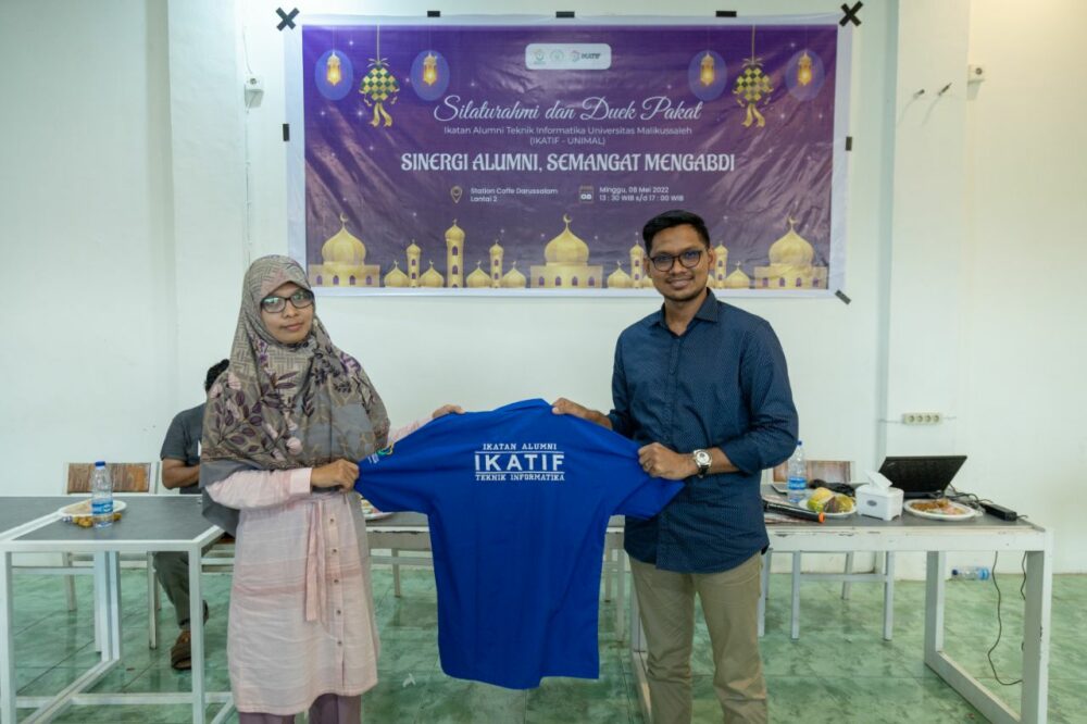 Ketua Program Studi Teknik Informatika Universitas Malikussaleh, Zara Yunizar, S. Kom., M. Kom menyerahkan baju Ikatif kepada Ketua Ikatif terpilih Firdaus Noezula. (Foto : Ril)
