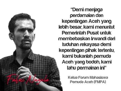 “Terus terang saya pernah berkomomukasi dengan Irwandi, bagi beliau jabatan Gubernur sudah tidak terlalu penting, tapi beliau menempuh jalur masasi beliau ingin membuktikan bahwa beliau tidak sebagaimana dituduhkan, dan Aceh masih dikelilingi oleh mafia hukum,” pungkas Fahmi.