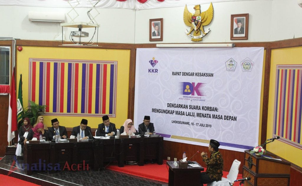 Analisaaceh.com, LHOKSEUMAWE | Komisoner Komisi Kebenaran dan Rekonsiliasi (KKR) Aceh saat mendengarkan pemaparan antropolog dalam Rapat Dengar Kesaksian (RDK) terhadap 17 korban konflik Aceh yang digelar pada 16-17 Juli 2019 di Gedung DPRK Aceh Utara di Lhokseumawe. (AA/Dayat)
