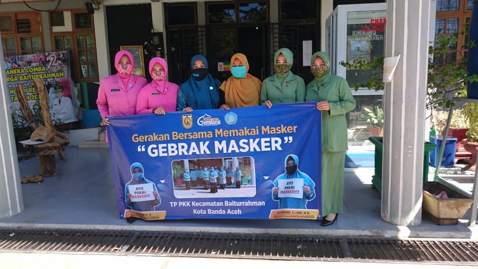 Analisaaceh.com, Banda Aceh | TP PKK Kecamatan Baiturrahman bersama Organisasi Bhayangkari Polsek dan Persit Koramil Baiturrahman menggelar Gerakan Bersama Memakai Masker (Gebrak Masker), Rabu (19/8/2020).