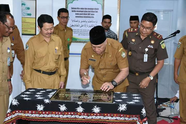 Bupati Aceh Tengah Shabela Abubakar tanda tangani prasasti peresmian gedung rawat inap penyakit dalam pria didampingi Dirut RSUD Datu Beru Takengon Hardiyanis dan Kepala Kejaksaan Negeri Takengon Nislianudin, Senin (10/1) ©Karmiadi - Analisaaceh.com