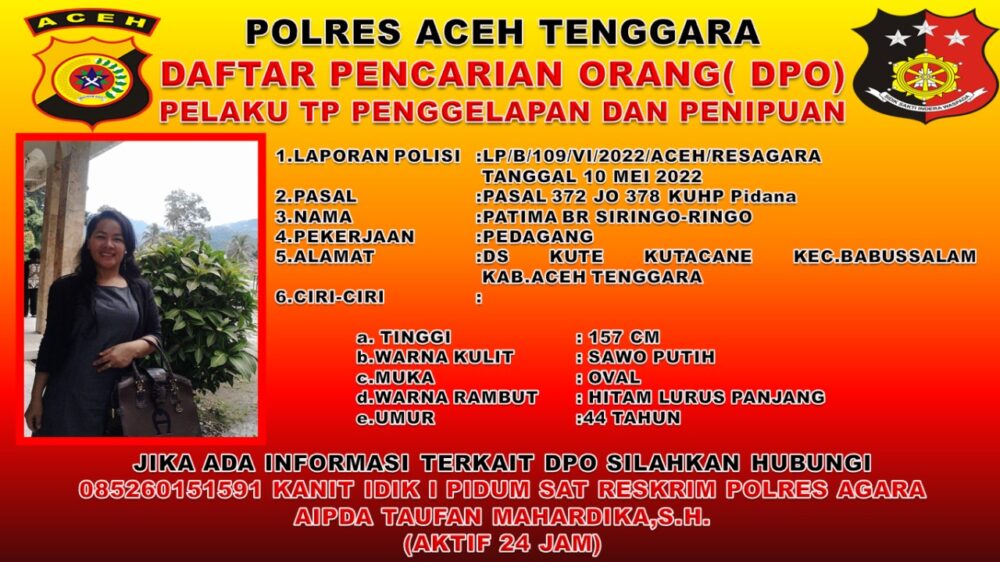 “Polres Aceh Tenggara telah menetapkan Patima Br Siringo-Ringo sebagai tersangka yang telah melarikan diri dan telah diterbitkan DPO oleh Sat Reskrim,” pungkas Iptu Muhammad Jabir.